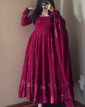 Mirror Work Anarkali – Elegant Maroon Edition with Bell Sleeves