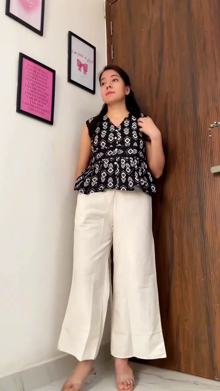 Black & White Printed Peplum Top with White Pants – Chic sleeveless peplum top paired with wide-leg trousers for a sleek and elegant look.
