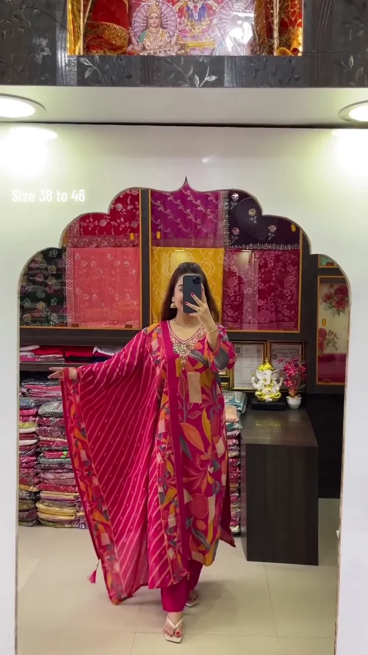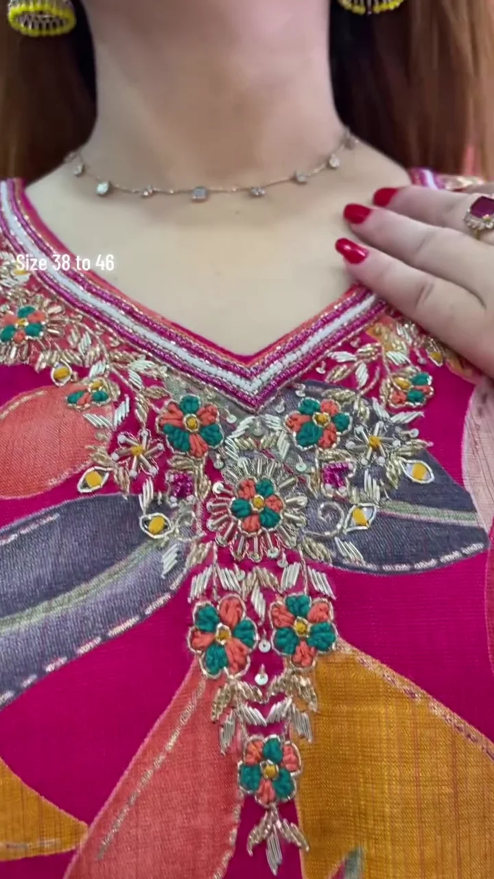 + Free ShippingElevate your ethnic wardrobe with this stunning Rani Pink Kaftan-inspired Kurta Set. Designed for the modern woman who values both comfort and high-fashion, this ensemble features a bold, artistic floral print and intricate neckline detailing. Whether it’s a festive celebration, a Mehendi ceremony, or a sophisticated social gathering, this outfit ensures you stand out with effortless grace.