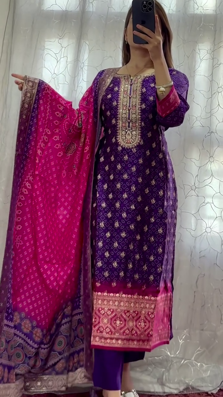 Contrasting Pink Printed Dupatta ? A beautifully contrasting pink dupatta with elegant prints that complements the rich purple kurta and adds an extra layer of sophistication.