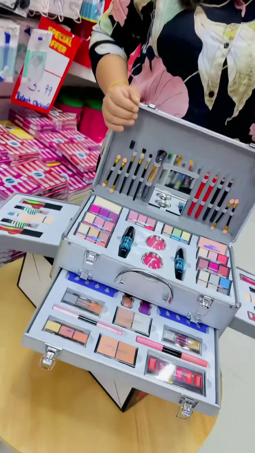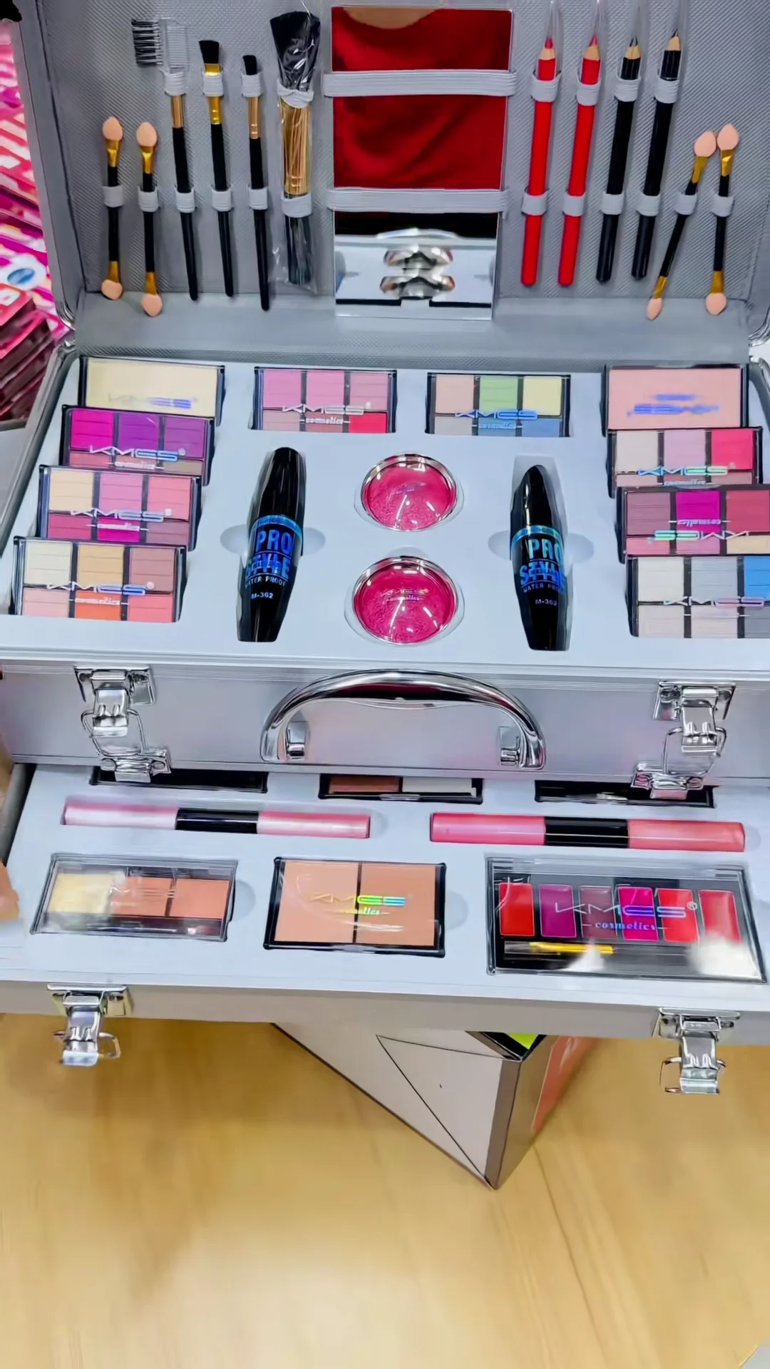 + Free ShippingElevate your beauty routine with the ultimate KMES Professional Makeup Kit. This all-inclusive vanity case is meticulously organized into multiple tiers, offering a vast spectrum of colors and tools to create any look—from natural day wear to high-glamour evening styles. Housed in a durable, sleek silver aluminum “train case,” it is perfect for travel, storage, or as a centerpiece for your dressing table.