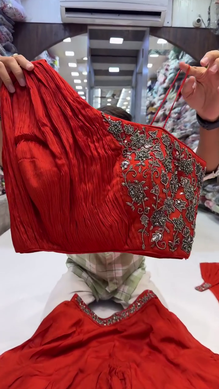 The choli has pleated fabric on one side, giving it a unique and modern twist.